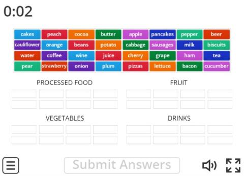 Group the food and drink into four categories: Processed food, fruit, vegetables and drink.
