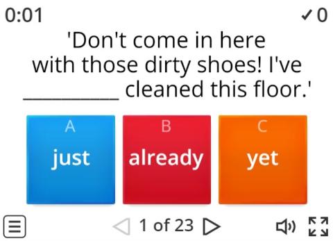 Present perfect multiple choice questions with 'just', 'already' and 'yet'.