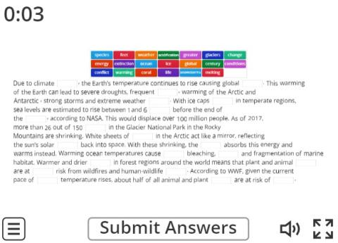 Cloze activity, putting missing words into text about the effects of Climate Change.